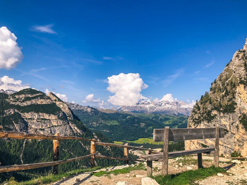Una volta in vetta puoi finalmente tirare un sospiro di sollievo ma soprattutto goderti una meravigliosa vista panoramica con l’inconfondibile Sella e fino alla Marmolada. Nei cartelli indicano un’ora di tempo per arrivarci, ma se hai un buon passo, saranno solo 40 minuti di fiato lungo.